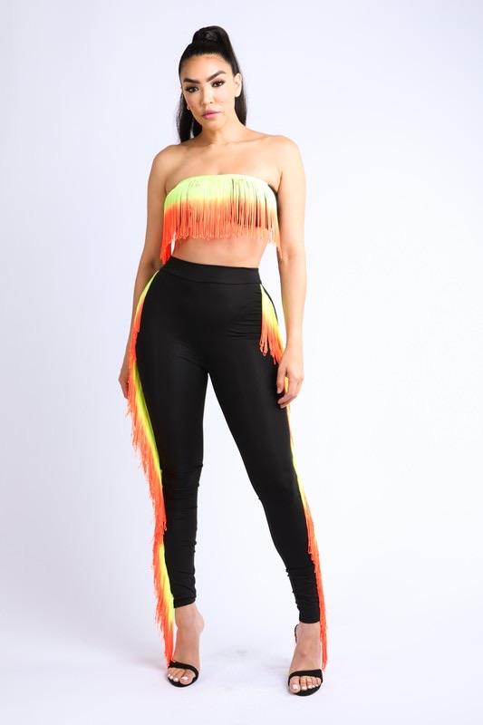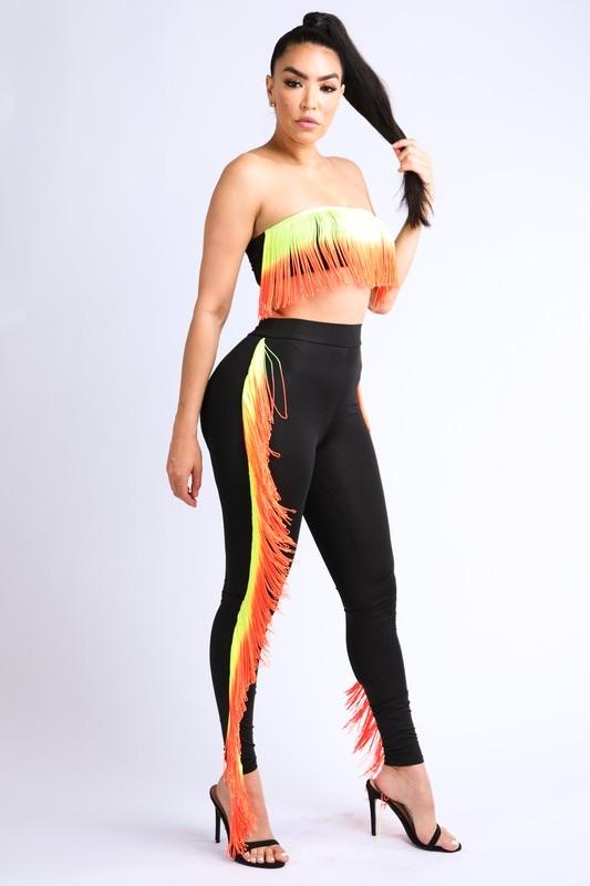 Gradient fringe tube top set with leggings - gradient color contrast fringe - fringe top and matching leggings set Model is 5"9 inches tall, and she is wearing size small |